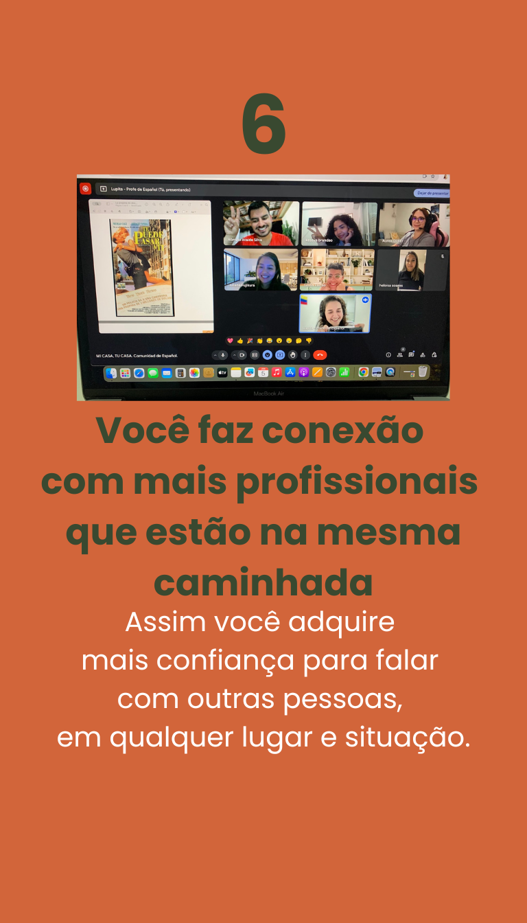 Conversação guiada, prática real, correção imediata, dinâmicas entre alunos e feedback direto da Profe Lupita. Aqui você fala espanhol de verdade, sem medo, sem julgamento e sem portunhol.